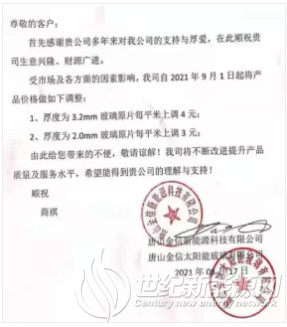 但稳定的局面随着日前金信玻璃的一纸通告而打破。金信玻璃在其通知函中表示“受市场及各方面因素影响”,3.2mm玻璃每平上调4元,2.0mm则上调3元。由此也拉开了玻璃涨价的序幕。