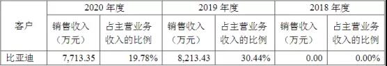 同时,公告显示,2019年、2020年,融捷股份与比亚迪分别形成销售收入8313.43万元、7713.35万元,占主营业务收入比例分别为30.44%、19.78%。