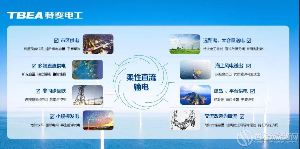 在海上风电柔直外送应用场景,特变电工提出了针对远海风电柔直外送系统解决方案,包括1GW、2GW整装输出系统方案,和以往工程比较,换流阀设备占地减小30%左右,减重20%左右,采用柔性直流输电技术,可将海上风电等新能源友好可靠接入电网。
