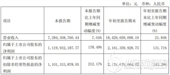 10月28日,明阳智能发布三季度业绩公告称,第三季度公司实现营业收入约72.84亿元,同比增长7.04%。实现归属于上市公司股东的净利润约11.2亿元,同比增长178.49%。