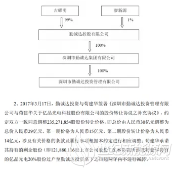 在此公告中明确,荀建华与勤诚达投资的股份转让合作分为两期,当两期合作完成之后,勤诚达投资所持股份将占公司总股本的20%,成为公司第一大股东,古耀明将成为亿晶光电实际控制人,荀建华占比则降至10.36%。标的总价30亿元,后调整为29亿元。双方且在人事上有着明确的约定。