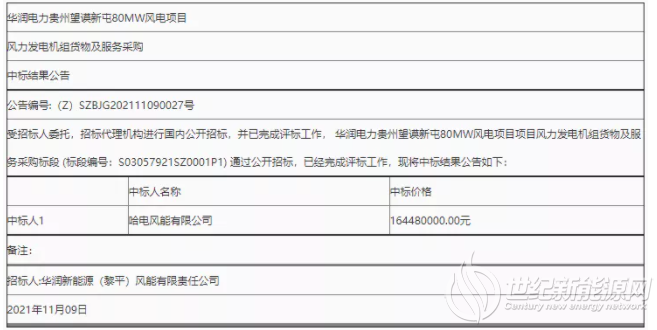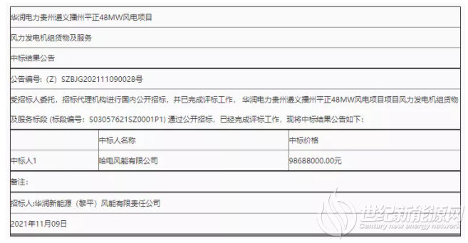 公告显示,新疆金风科技股份有限公司成功中标华润电力邓州100MW风电项目,投标报价约2.7亿元。哈电风能有限公司成功中标华润电力贵州遵义播州平正48MW风电项目以及华润电力贵州望谟新屯80MW风电项目,投标报价分别约9869万元、1.645亿元。