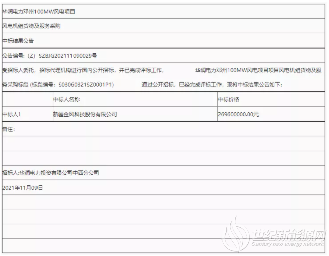 华润电力邓州100MW风电项目风电机组货物及服务采购中标结果公告
