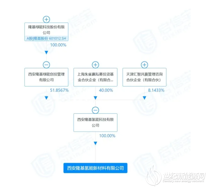 股权结构显示,隆基氢能新材料由西安隆基氢能科技有限公司(下称隆基氢能科技)100%持股。
