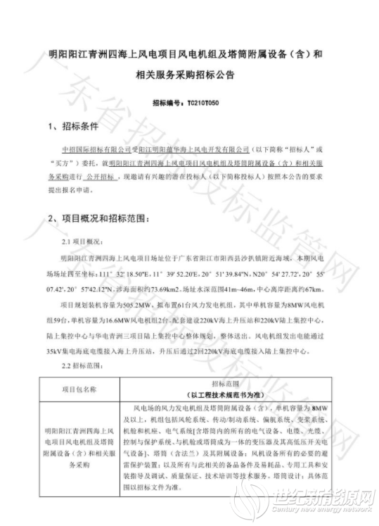 项目规划装机容量为505.2MW,拟布置61台风力发电机组,其中单机容量为8MW风电机组59台,单机容量为16.6MW风电机组2台。配套建设220kV海上升压站和220kV陆上集控中心,陆上集控中心与华电青洲三项目陆上集控中心整体规划,整体送出。风电机组发出电能通过35kV集电海底电缆接入海上升压站,升压后通过2回220kV海底电缆接入陆上集控中心。