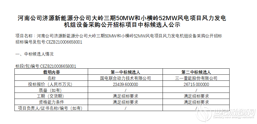 近日,国电河南公司济源新能源分公司大岭三期50兆瓦和小横岭52兆瓦风电设备采购项目中标候选人公示,其中联合动力投标报价2.34亿元,成为第一中标候选人;三一重能投标报价2.67亿元,成为第二中标候选人。