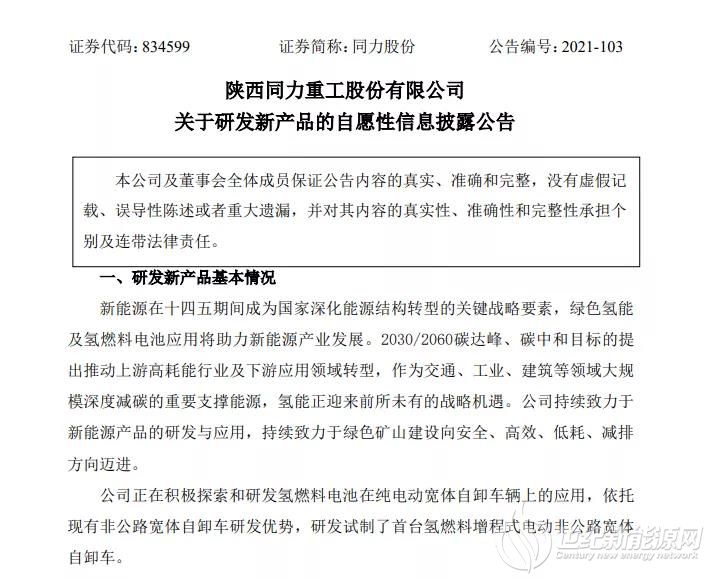 公告显示,新能源在十四五期间成为国家深化能源结构转型的关键战略要素,绿色氢能及氢燃料电池应用将助力新能源产业发展。2030/2060碳达峰、碳中和目标的提出推动上游高耗能行业及下游应用领域转型,作为交通、工业、建筑等领域大规模深度减碳的重要支撑能源,氢能正迎来前所未有的战略机遇。公司持续致力于新能源产品的研发与应用,持续致力于绿色矿山建设向安全、高效、低耗、减排方向迈进。