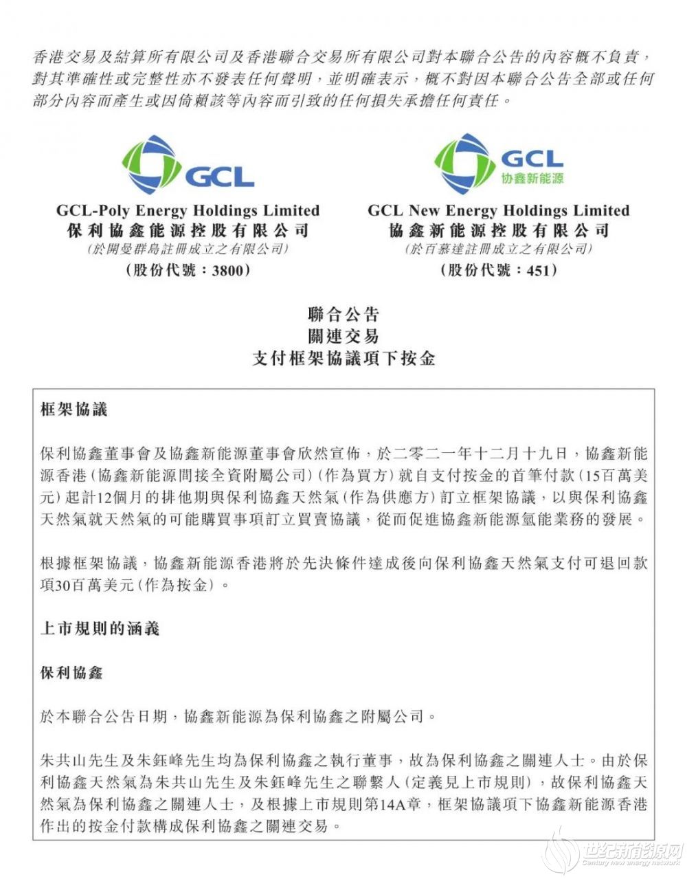 上述框架协议将使协鑫新能源取得丰富且廉价的天然气,确立发展“蓝氢”的巨大气源优势,有效支撑协鑫新能源打造成为国际主要的氢能供应商及综合能源管理服务商。