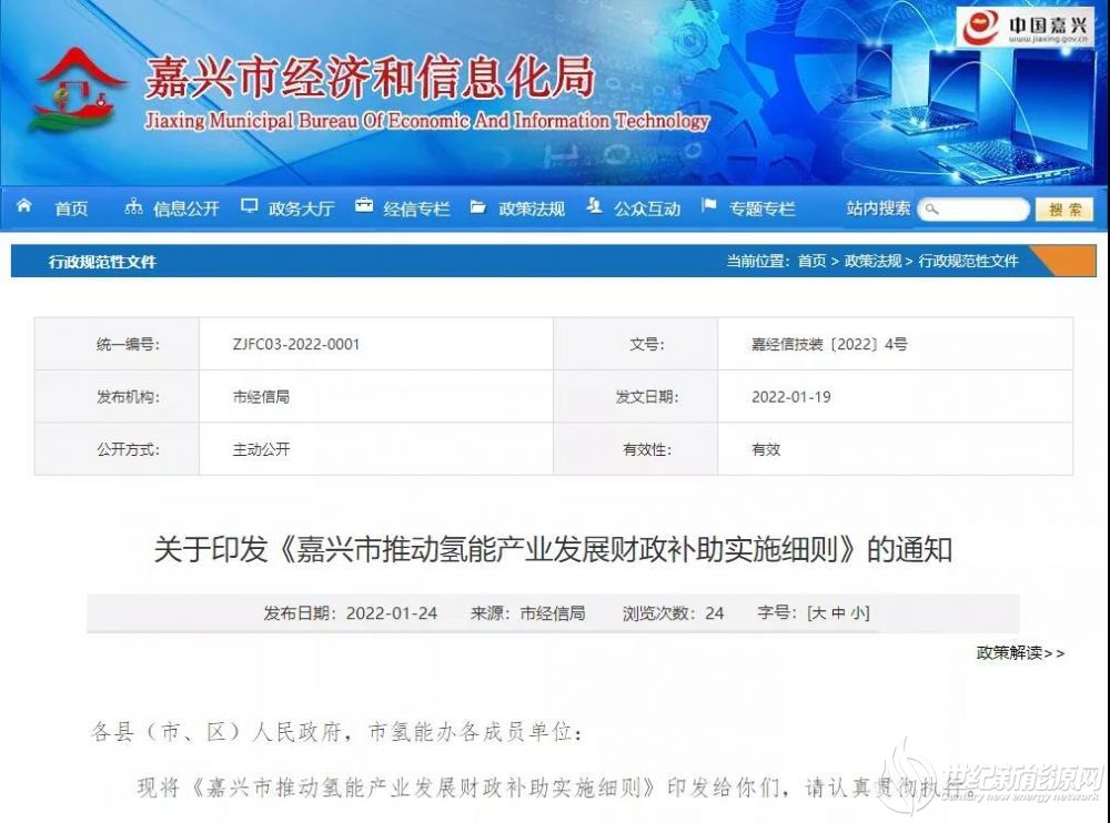 关于印发《嘉兴市推动氢能产业发展财政补助实施细则》的通知