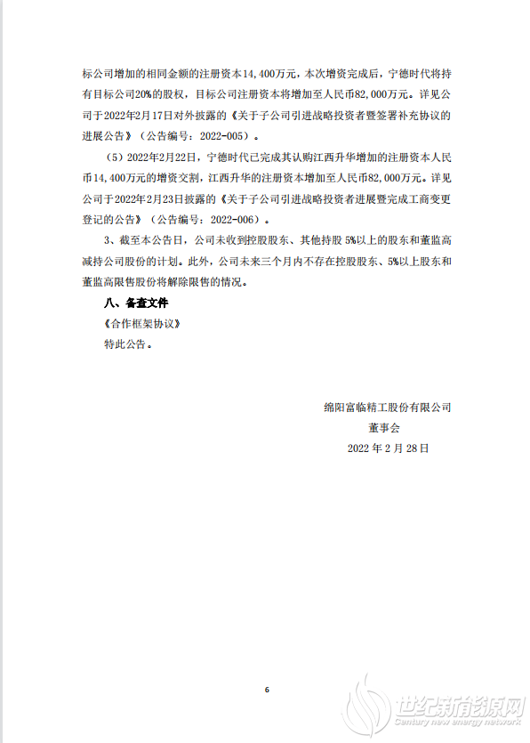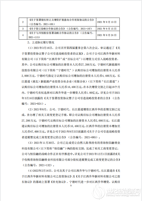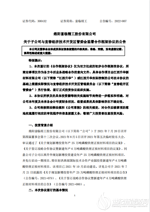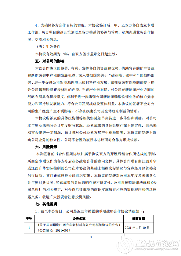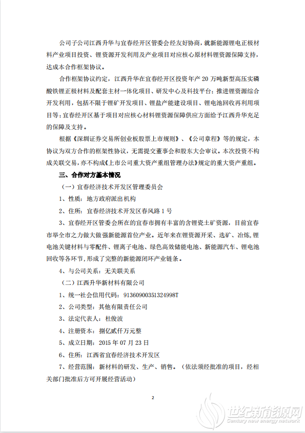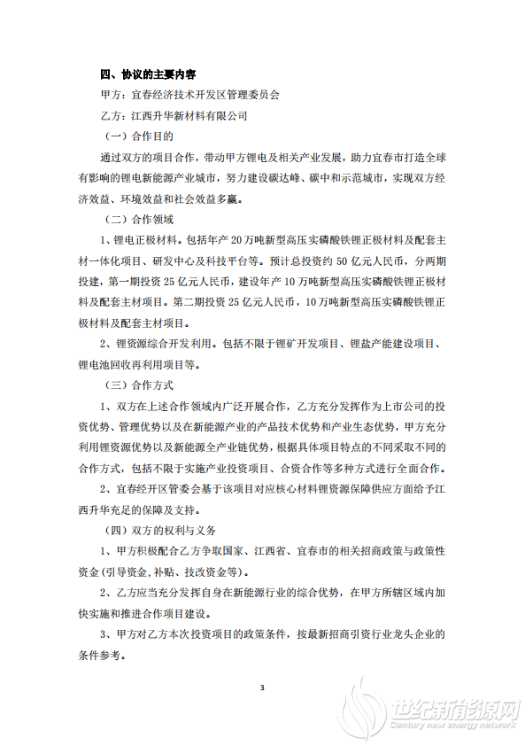根据协议,江西升华在宜春经开区投资年产20万吨新型高压实磷酸铁锂正极材料及配套主材一体化项目、研发中心及科技平台;推进锂资源综合开发利用,包括不限于锂矿开发项目、锂盐产能建设项目、锂电池回收再利用项目等;宜春经开区基于项目对应核心材料锂资源保障供应方面给予江西升华充足的保障及支持。