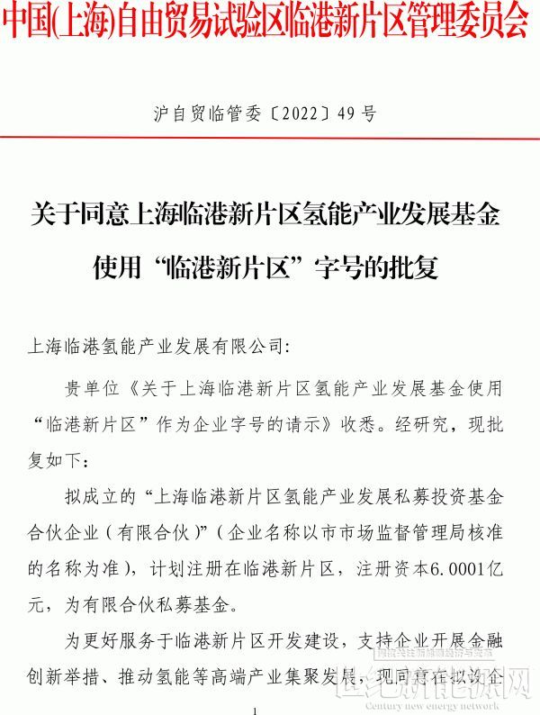近日,上海临港区政府印发了《关于同意上海临港新片区氢能产业发展基金使用“临港新片区”字号的批复》(以下简称“《批复》”)。