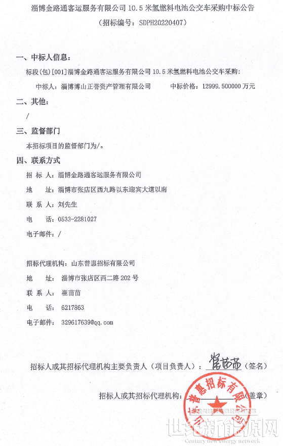 4月28日,淄博金路通客运服务有限公司发布10.5米氢燃料电池公交车采购中标公告,中标人为淄博博山正誉资产管理有限公司,中标价格为12999.5万元。