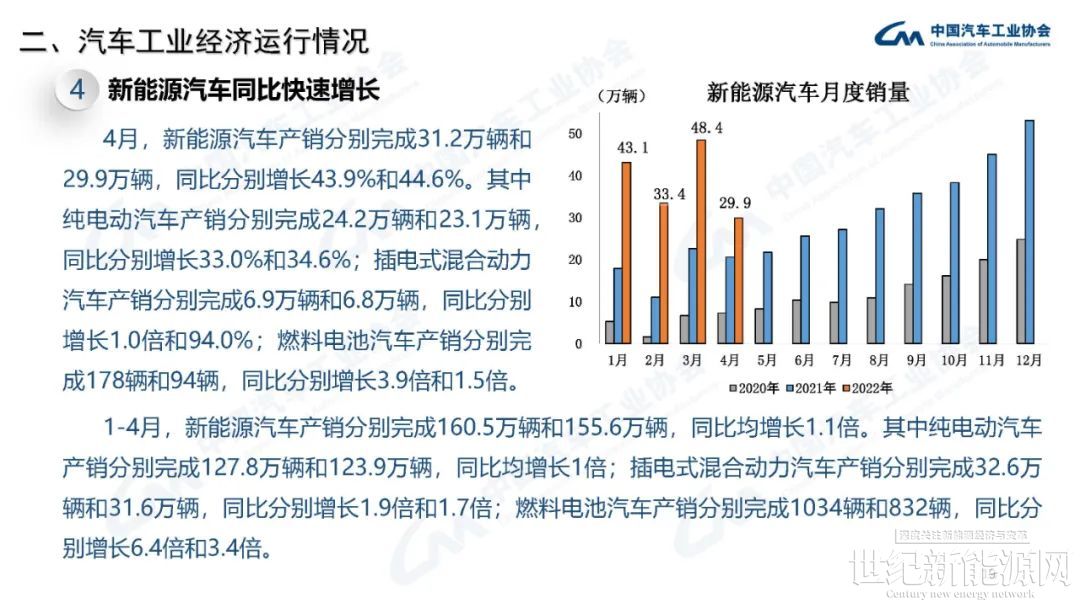 4月,新能源汽车产销分别完成31.2万辆和29.9万辆,同比分别增长43.9%和44.6%。其中纯电动汽车产销分别完成24.2万辆和23.1万辆,同比分别增长33.0%和34.6%;插电式混合动力汽车产销分别完成6.9万辆和6.8万辆,同比分别增长1.0倍和94.0%。