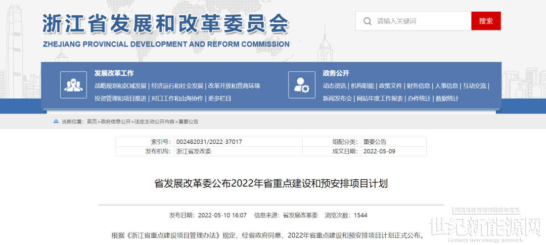 5月10日,浙江省发展改革委发布2022年省重点建设和预安排项目计划。