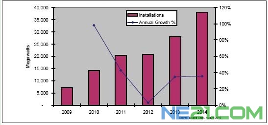 图:iSuppli 对2009-2014年全球光伏装机容量预测