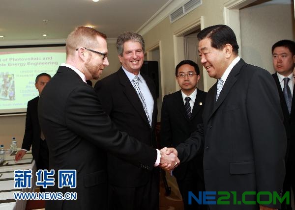 4月10日,全国政协主席贾庆林在悉尼听取新南威尔士大学澳国家太阳能光伏研究中心负责人的情况介绍。 新华社记者 刘卫兵 摄