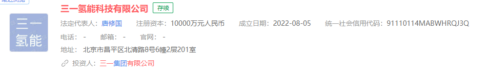 8月5日,三一氢能科技有限公司成立,注册资本1亿元人民币。公司企业法人为三一集团有限公司。合伙企业包括北京盛源氢企业管理合伙企业(有限合伙)、北京氢元春企业管理合伙企业(有限合伙)。