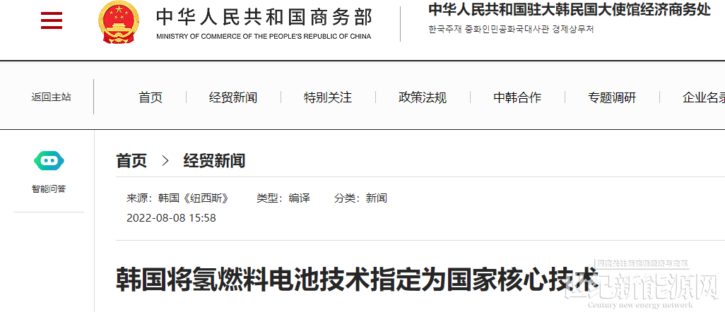 据韩国纽西斯8月4报道,韩国产业通商资源部4日表示,将从4日起正式实施《关于指定国家核心技术等相关告示部分修订案》,将氢燃料电池相关的两项技术追加指定为国家核心技术,以防止技术外流。