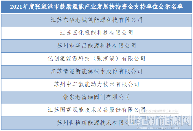 8月22日,张家港市发改委发布了符合扶持政策规定的9家单位,其中包括江苏东华港城氢能源科技有限公司、江苏嘉化氢能科技有限公司、苏州市华昌能源科技有限公司、亿创氢能源科技(张家港)有限公司、江苏清能新能源技术股份有限公司、苏州中车氢能动力技术有限公司、张家港富瑞阀门有限公司、江苏国富氢能技术装备股份有限公司和苏州世椿新能源技术有限公司。
