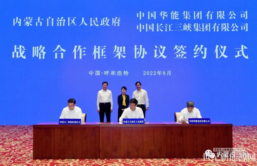 8月24日,自治区政府分别与中国华能集团有限公司、中国长江三峡集团有限公司在呼和浩特签署战略合作框架协议。自治区党委副书记、自治区主席王莉霞,华能集团总经理邓建玲,三峡集团总经理韩君见证签约。