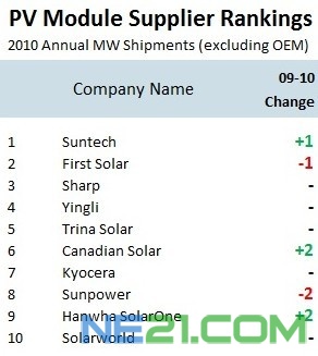IMS Research的光伏市场分析师Sam Wilkinson表示:“2010年对光伏产业的每家企业来说都是非同凡响的一年。组件供应商在巨大的需求中获益,出货量都大大增加。排名前十的供应商中有一半的出货量都翻了一倍,甚至有的企业增长了超过150。.”