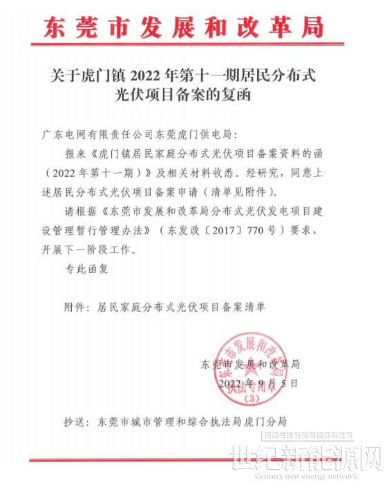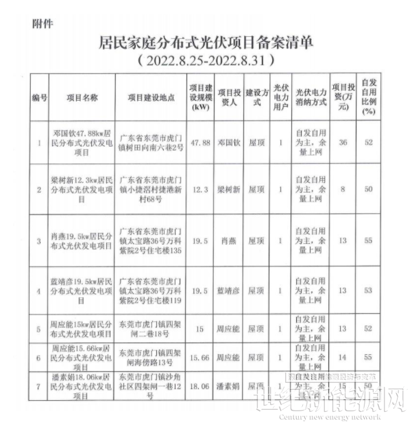 9月8日,广东省东莞市人民政府公布虎门镇2022年第十一期居民分布式光伏项目备案清单,共计7个户用光伏项目,总规模147.9kW。