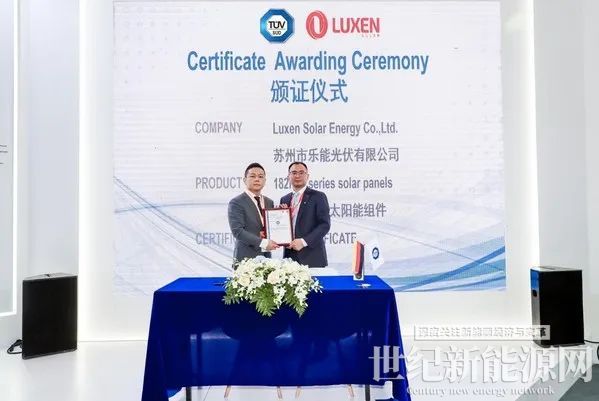在第十五届(2021)国际太阳能光伏与智慧能源(上海)展览会暨论坛期间, TÜV南德意志集团为乐能光伏182双玻系列组件颁发TÜV 南德认证证书。收获该认证意味着乐能光伏的这款双玻光伏组件符合IEC 61215:2016、IEC 61730:2016标准,各项指标均已达到国际测试认证标准。