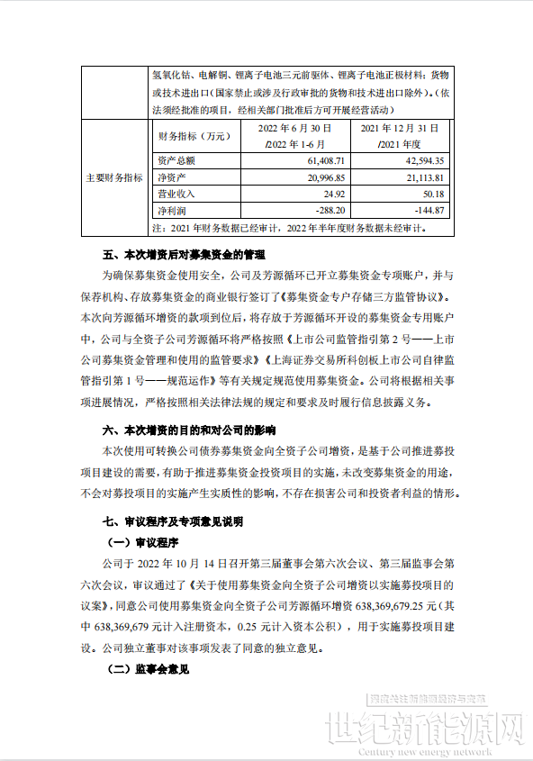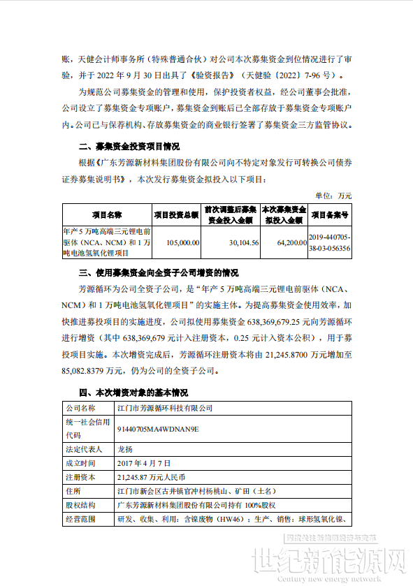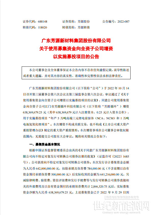 10月14日晚,,芳源股份发布公告称,使用募集资金向全资子公司江门市芳源循环科技有限公司(以下简称“芳源循环”)增资6.38亿元,用于实施募投项目“年产5万吨高端三元锂电前驱体(NCA、NCM)和1万吨电池氢氧化锂项目”。