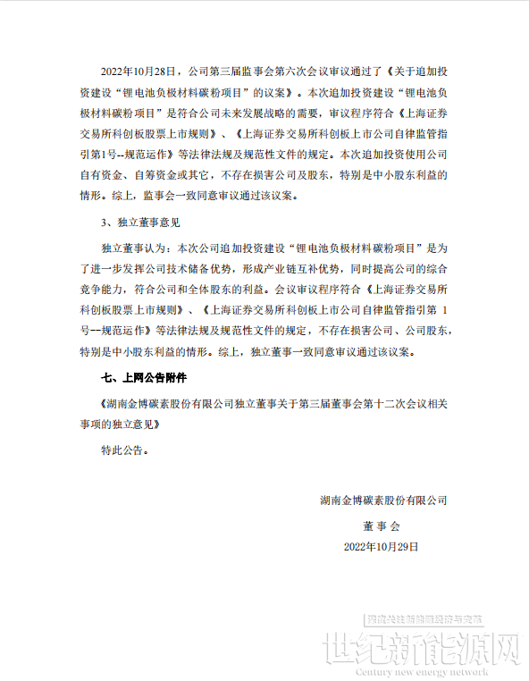 10月29日,金博股份发布公告称,公司计划在“年产1万吨锂电池负极材料用碳粉制备一体化示范线项目”基础上追加投资建设“年产9万吨锂电池负极材料用碳粉制备项目”,项目预计总投资金额不超过23亿元(不含示范线投入金额),建设时间周期12个月,投资资金来源为公司自有资金、自筹资金或其它。