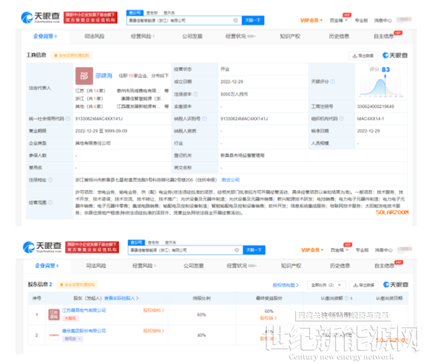 天眼查App显示,近日,康晟佳智慧能源(浙江)有限公司成立,法定代表人为邵建海,注册资本5000万人民币,经营范围包括光伏设备及元器件制造;光伏设备及元器件销售;新兴能源技术研发;电池销售;集成电路销售;物联网技术服务;太阳能发电技术服务等。股东信息显示,该公司由江苏晟高电气有限公司、康佳集团股份有限公司共同持股。