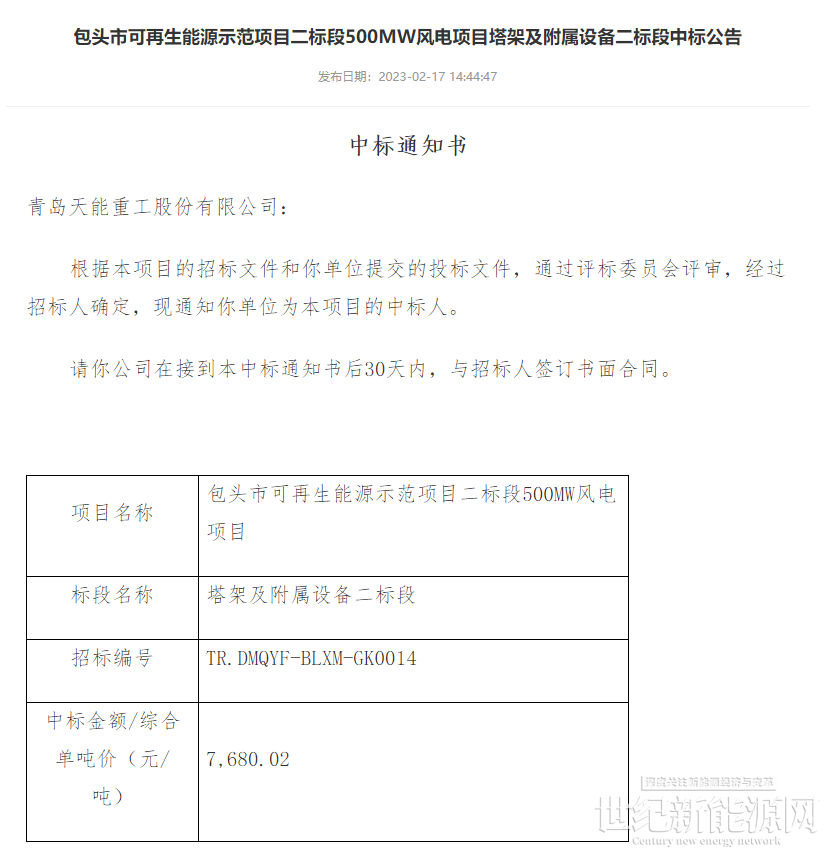 2月17日,包头市可再生能源示范项目二标段500MW风电项目塔架及附属设备二标段中标公告发布。