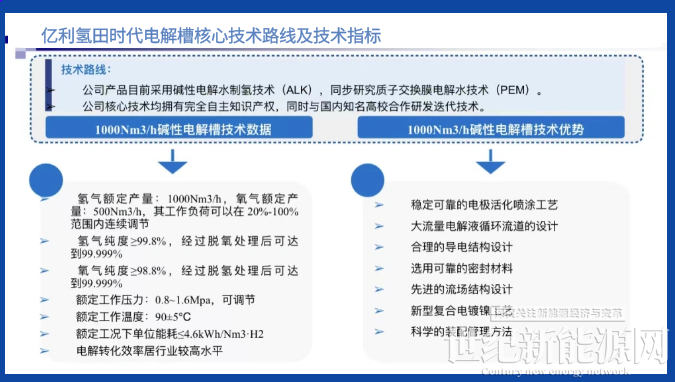 亿利氢田时代技术总监朱成元介绍,亿利1000标方碱性电解槽具备能耗低、自动化强、适变性强、降本成效显著等特点。具体来看,该电解槽一是采用高电流密度技术,实现单槽制氢产量1000Nm³/h,能耗4.3-4.6kWh/Nm³H2,工作压力0.8-1.6Mpa;二是系统无人值守、全自动化运行、远程一键启停;三是系统的20-110%宽频调谐能力和快速启动能力很好地适应了可再生能源波动性的特点,从而可直接接入非并网电力;四是实现从源头降低制氢用电的费用,大幅降低绿氢成本,“而且其零排污系统创新性地运用及高效低耗的性能受到行业瞩目,系统零排污创新设计满足节能环保的严苛要求,同时保障系统稳定长效运行”