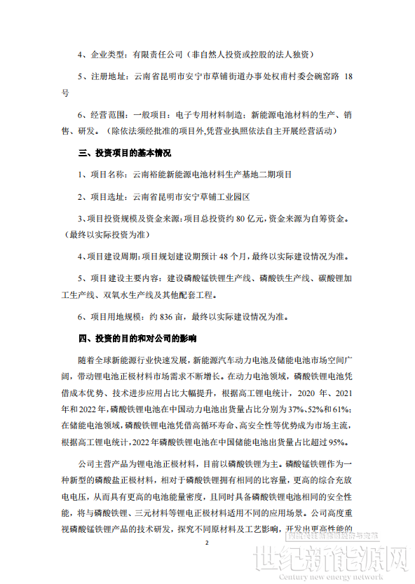 4月24日晚间,湖南裕能发布公告称,公司董事会审议通过了《关于投资建设云南裕能新能源电池材料生产基地二期项目的议案》,公司拟通过全资子公司云南裕能新能源电池材料有限公司投资建设云南裕能新能源电池材料生产基地二期项目,项目总投资约80亿元,项目规划建设期48个月。