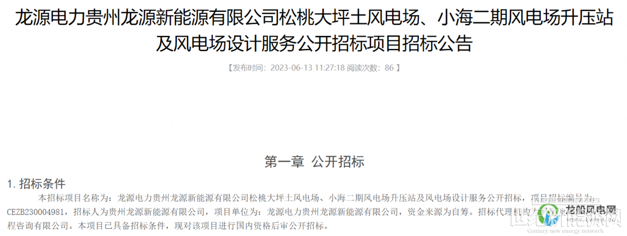 6月13日,国家能源招标网发布《龙源电力贵州龙源新能源有限公司松桃大坪土风电场、小海二期风电场升压站及风电场设计服务公开招标项目招标公告》。