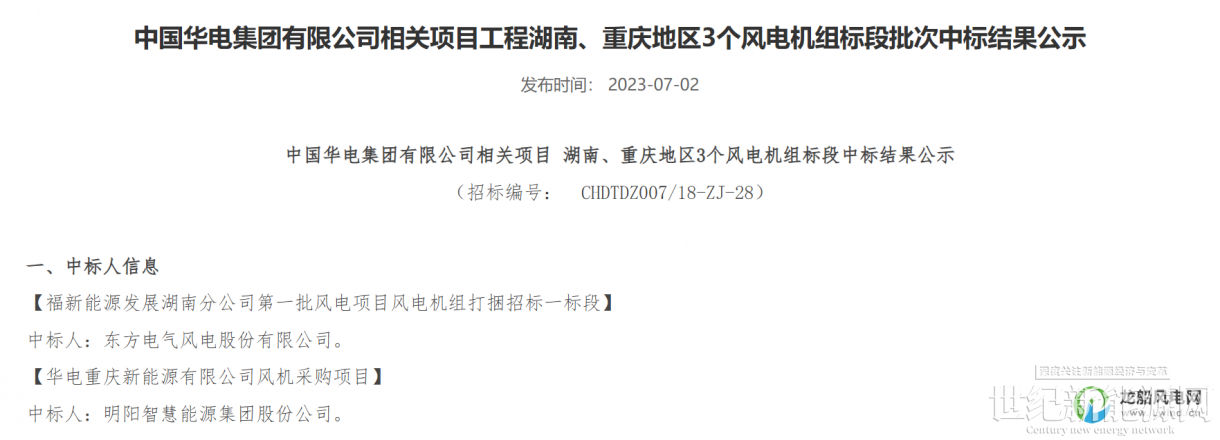公告显示,东方电气风电股份有限公司成功中标福新能源发展湖南分公司第一批风电项目风电机组打捆招标一标段。明阳智慧能源集团股份公司成功中标华电重庆新能源有限公司风机采购项目。