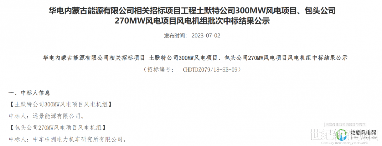 公告显示,远景能源有限公司成功中标土默特公司300MW风电项目风电机组。中车株洲电力机车研究所有限公司成功中标包头公司270MW风电项目风电机组。