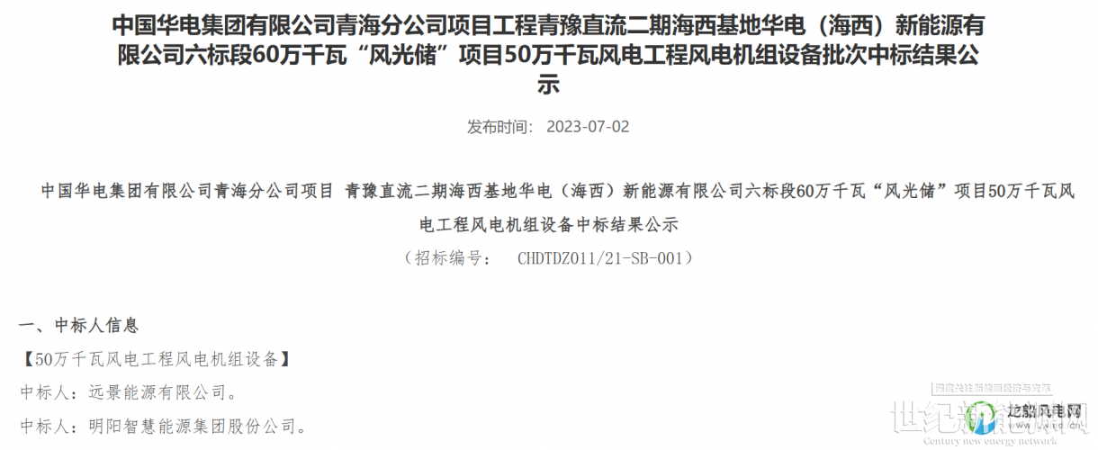 7月2日,华电集团电子商务平台接连发布《中国华电集团有限公司相关项目工程湖南、重庆地区3个风电机组标段批次中标结果公示》、《华电内蒙古能源有限公司相关招标项目工程土默特公司300MW风电项目、包头公司270MW风电项目风电机组批次中标结果公示》、《中国华电集团有限公司青海分公司项目工程青豫直流二期海西基地华电 (海西)新能源有限公司六标段60万千瓦“风光储”项目50万千瓦风电工程风电机组设备批次中标结果公示》的公告。