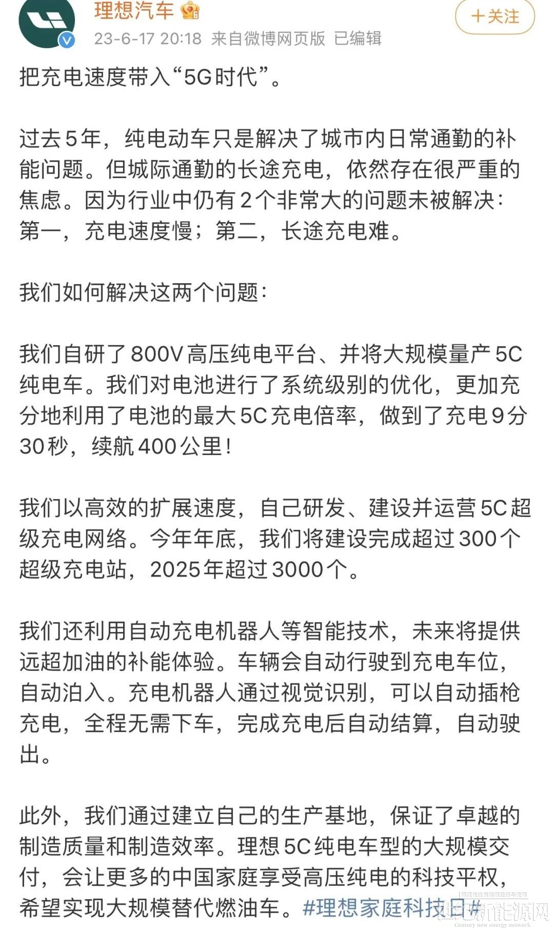 6月17日,理想汽车在微博中宣布,其对电池进行了系统级别的优化,能够充分利用电池的最大5C充电倍率,实现了仅需9分30秒充电就能续航400公里的效果。此外,他们还计划在2023年年底之前建设超过300个超级充电站,并在2025年前建成超过3000个充电站。