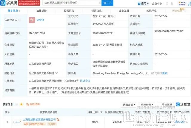 企查查APP显示,近日,山东爱旭太阳能科技有限公司成立,法定代表人为谢俊伟,注册资本24亿元人民币,经营范围包含:新兴能源技术研发;光伏设备及元器件制造;光伏设备及元器件销售等。企查查股权穿透显示,该公司由爱旭股份(600732)100%控股。