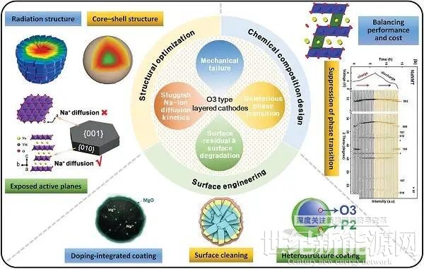 图3. O3型层状氧化物正极材料的主要挑战和优化策略示意图。