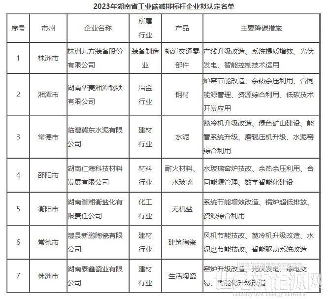 关于2023年湖南省工业碳减排标杆企业拟认定名单的公示