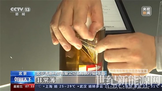 北京清驰科技有限公司首席执行官 张晶:这个就是我们的质子交换膜,它的厚度只有十二微米,相当于我们头发丝直径的十分之一,是非常薄的。我们在结构里面增加了一个叫增强层的特殊结构材料,来实现很薄,同时又高强度的这么一个产品。实际上我们凭手是不可能撕裂的。