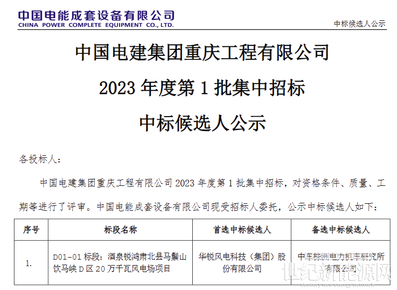 酒泉锐鸿肃北县马鬃山饮马峡D区20万千瓦风电场项目,第一候选人:华锐风电科技(集团)股份有限公司,第二候选人:中车株洲电力机车研究所有限公司。