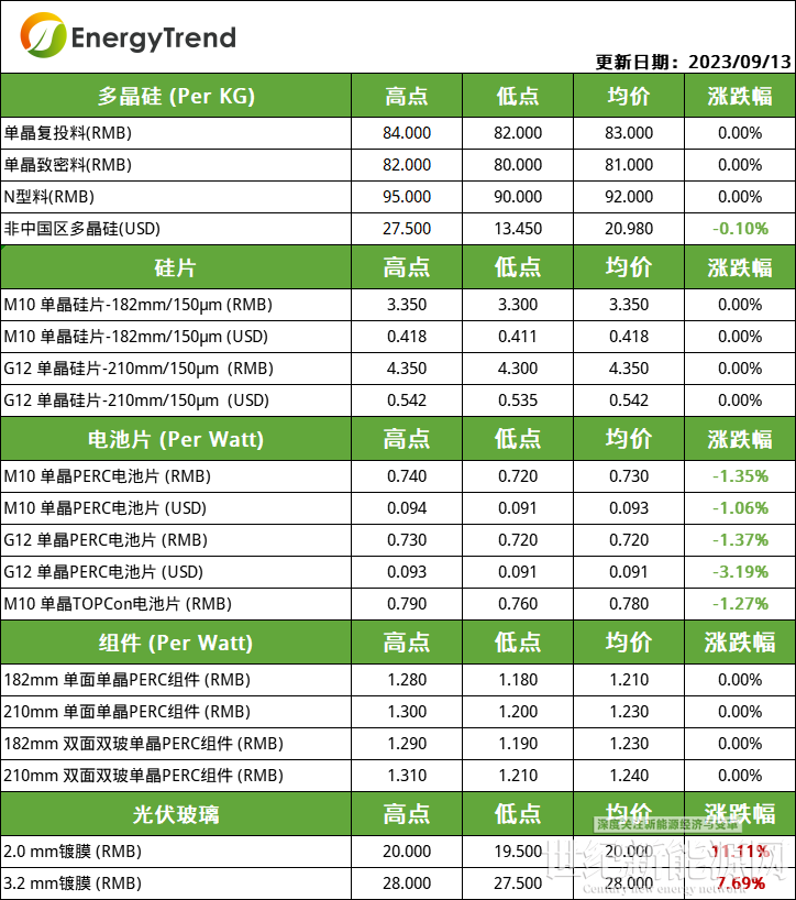 从供给端来看,9月硅片排产大幅提升,部分硅片企业因硅料采购困难,面临减产难题;从需求端来看,电池片受下游情绪降温影响,价格持续走跌,部分电池片企业对硅片的采购积极性减弱;硅片整体供需维持紧平衡状态、上游硅料价格持稳叠加下游降价情绪逐渐向上传导,硅片价格上涨缺乏有力支撑,预计短期内价格仍将持稳。