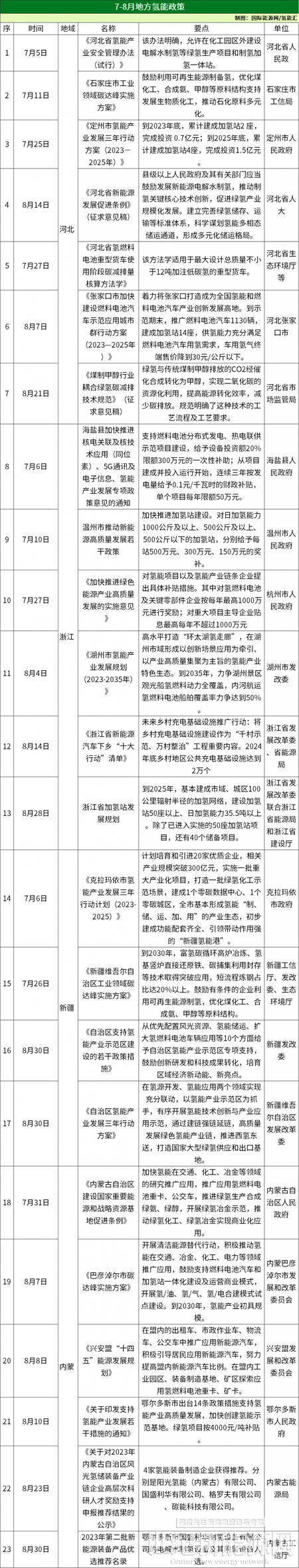 从地方来看,7到8月,有几个省(市)出台政策最“勤快”和密集,分别是河北、浙江、内蒙、广东、上海、新疆。其中河北、广东、上海作为燃料电池示范城市群“群主”所在地,对氢能的重视一以贯之,而内蒙和新疆对氢能的重视则是建立在能源大基地建设这一有利基础之上,尤其是新疆,虽然起步没有内蒙那么早,但是随着不断有氢能项目进行投建,尤其是中国规模最大的光伏发电直接制绿氢项目——新疆库车绿氢示范项目在8月30日全面投产,氢能也正在新疆获得更大的政策支持力。