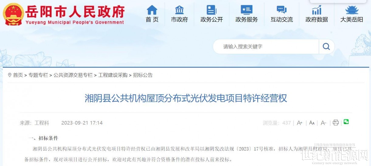 9月21日,湖南省岳阳市人民政府发布《湘阴县公共机构屋顶分布式光伏发电项目特许经营权招标公告》,招标人为湘阴县财政局。