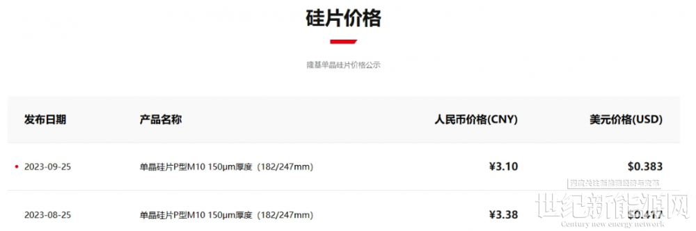 9月25日,隆基绿能公布了182mm单晶硅片的最新售价,从3.38元/片下调至3.10元/片,相比最近其官方报价下降0.28元/片,跌幅8.28%。