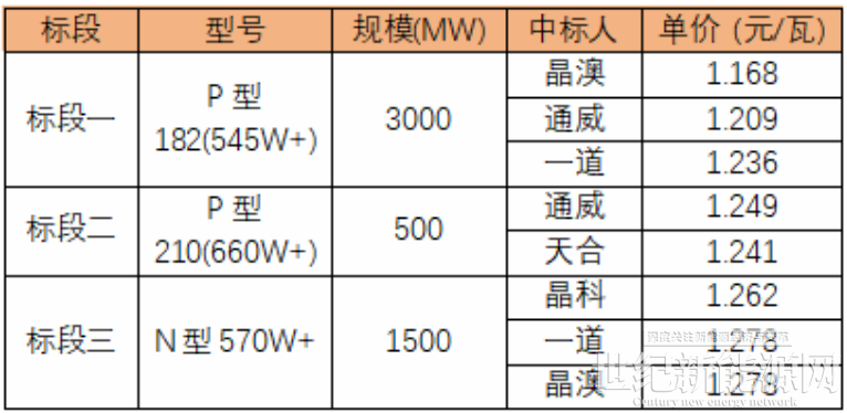 在三峡、京能、中广核公示的光伏组件中标结果或中标候选人中,P型最低中标价跌破1.2元/W,为1.168元/W,N型最低中标价1.216元/W。