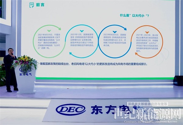 随着全球对可再生能源需求的日益增长,风电场建设和改造成为能源领域的热点话题。10月18日,在2023年北京国际风能大会暨展览会上,东方电气风电股份有限公司展示了针对早期投运风电场的“以大代小”整体解决方案和智能化预警解决方案。