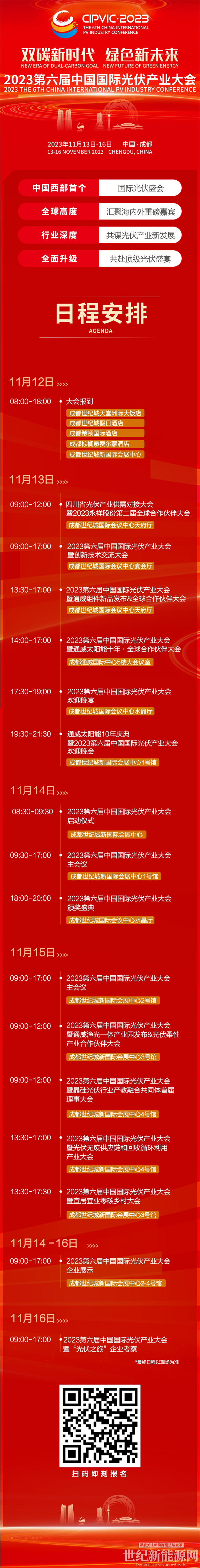 11月13-16日,2023第六届中国国际光伏产业大会将在四川成都隆重举行。作为我国西部首个国际光伏盛会,届时海内外重要领导、重磅嘉宾、行业大咖及全球光伏行业龙头企业将齐聚一堂,共话绿色低碳新未来!目前,大会日程已出炉,精彩纷呈的活动即将逐一呈现,敬请期待!点击上方二维码,即刻报名参与!